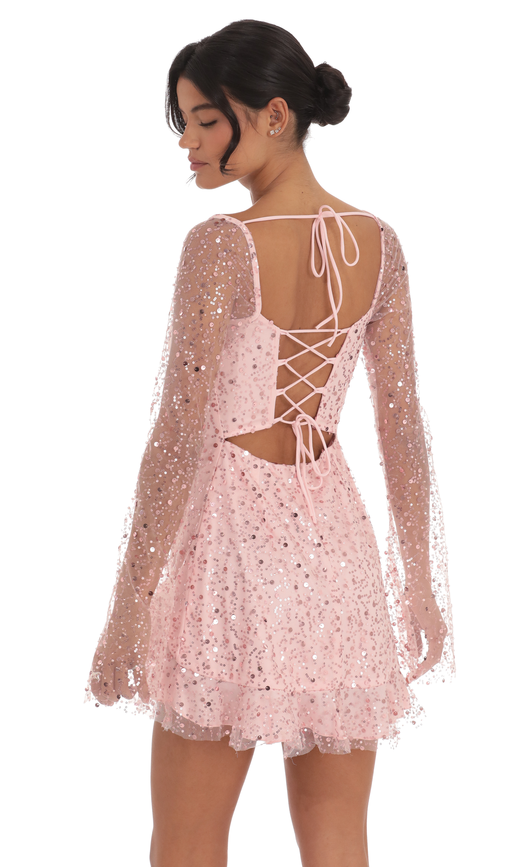 Sequin Long Sleeve Side Slit Dress in Light Pink