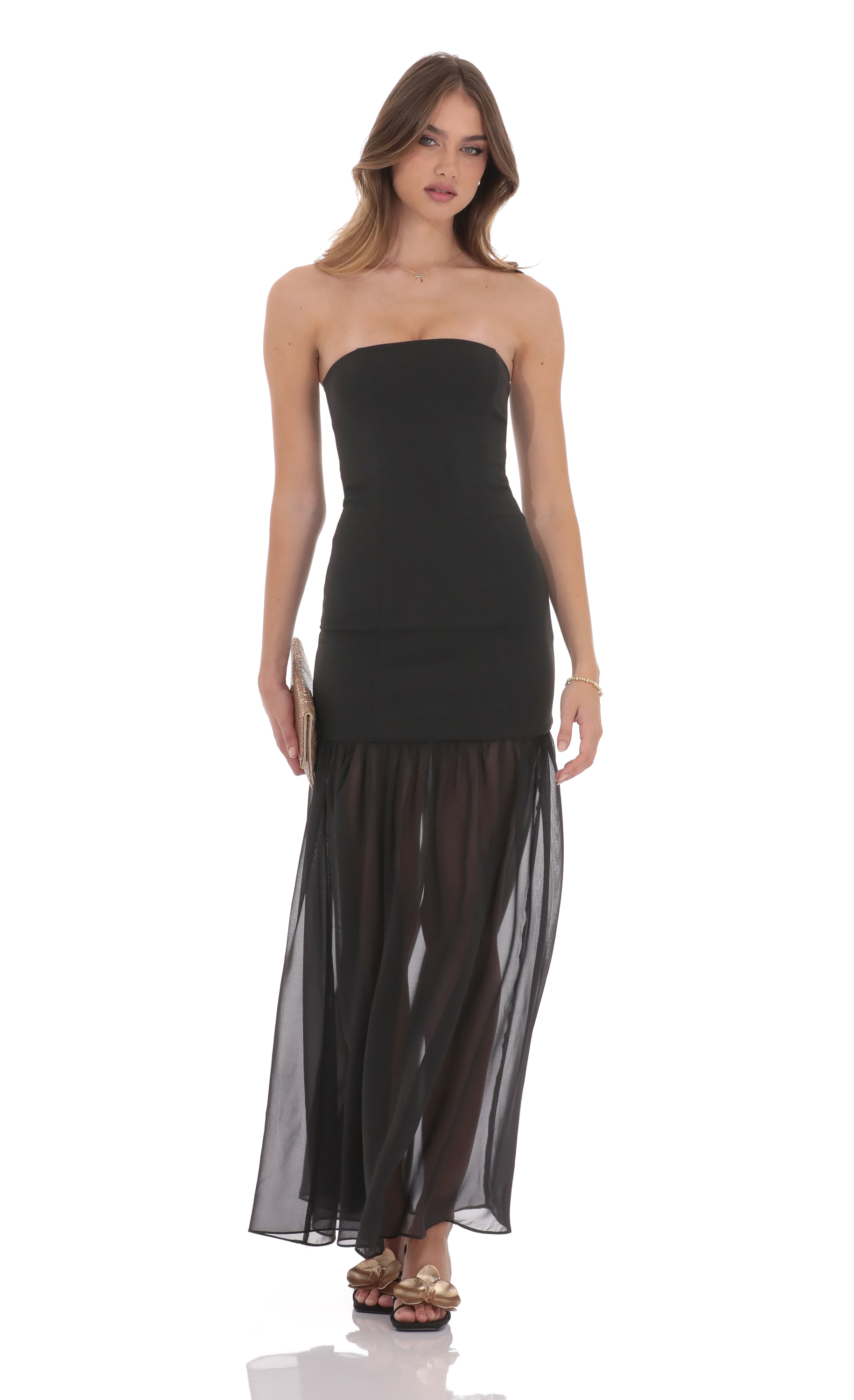 Strapless Chiffon Drop Skirt Maxi Dress in Black