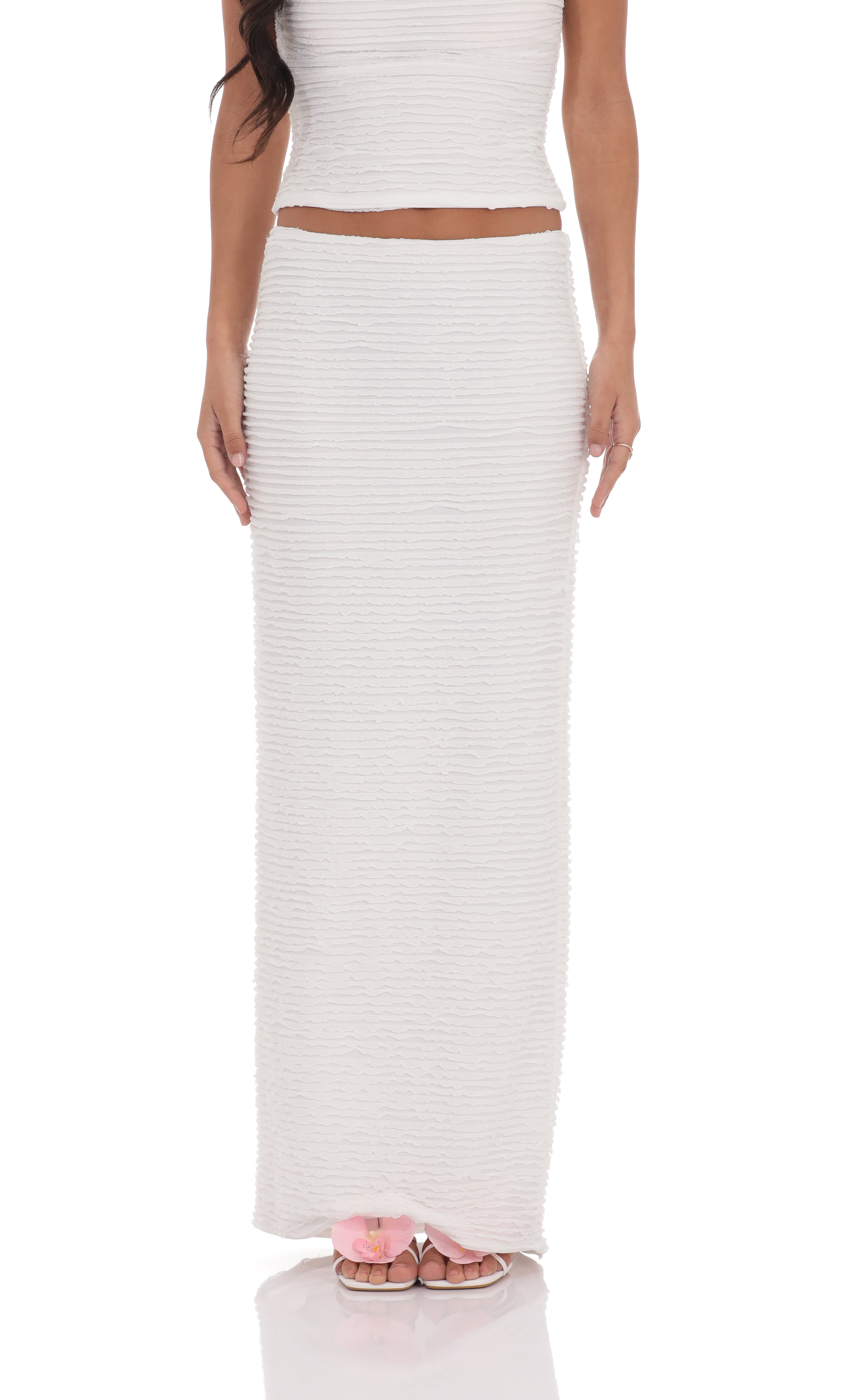 The model is wearing a size small skirt that measures 40in/102cm in length. Please note that measurements are taken when the style is lying flat.