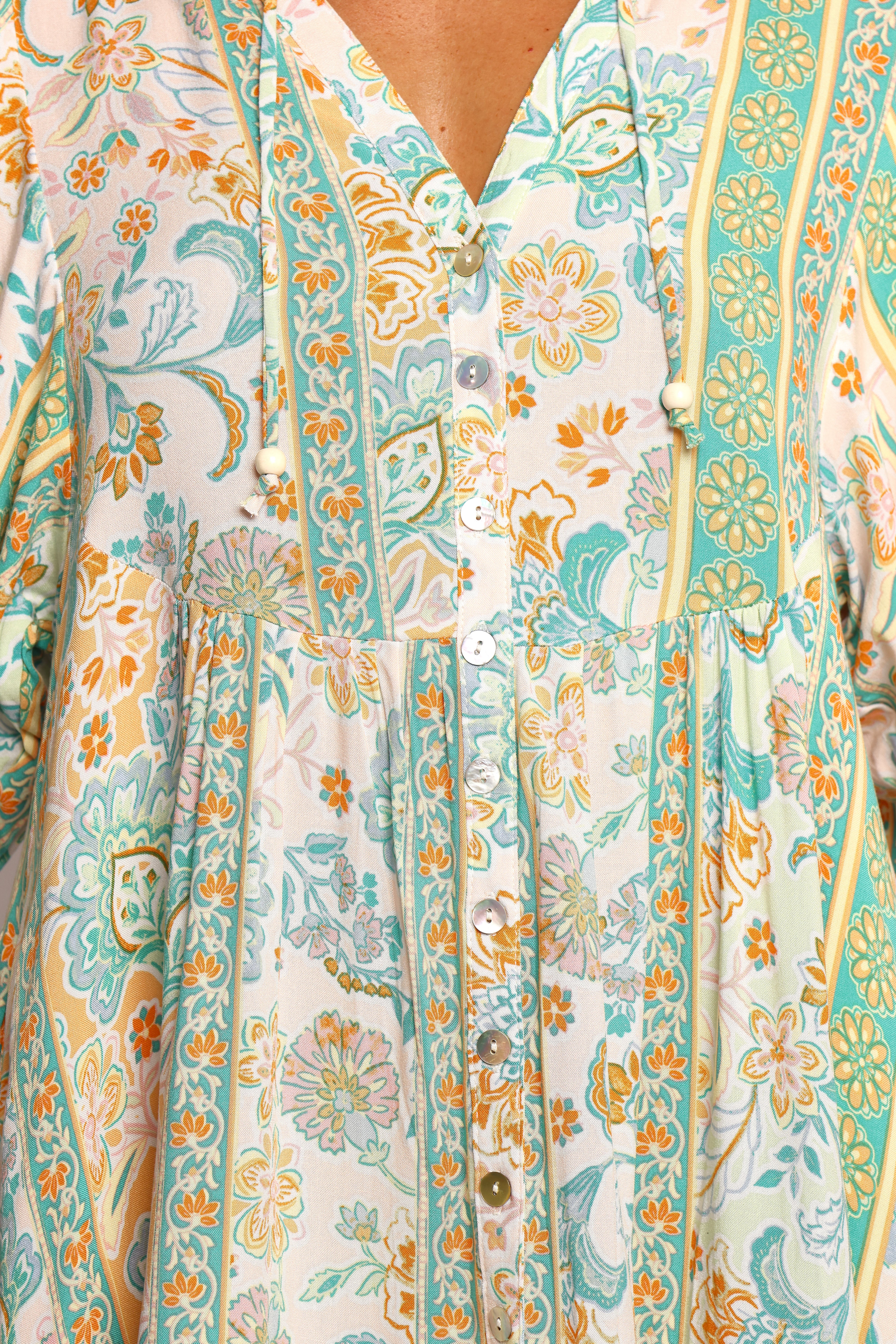 DETAILS Featuring a graceful v-neckline adorned with a delicate tie and bead detail. it adds just the right touch of elegance. The mid-length sleeves. complete with elasticised cuffs and charming beaded drawstring ties. offer both comfort and a dash of boho flair.