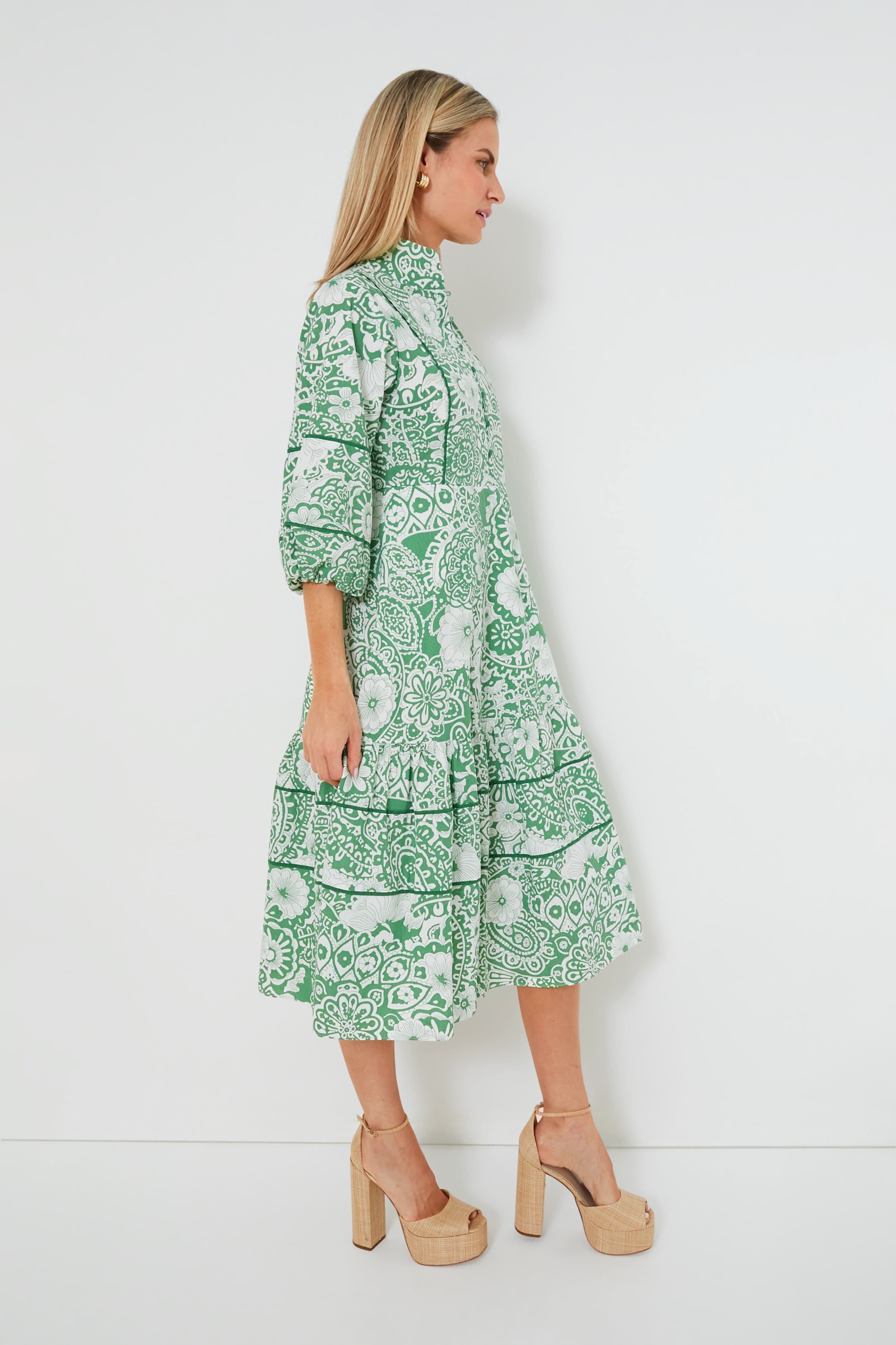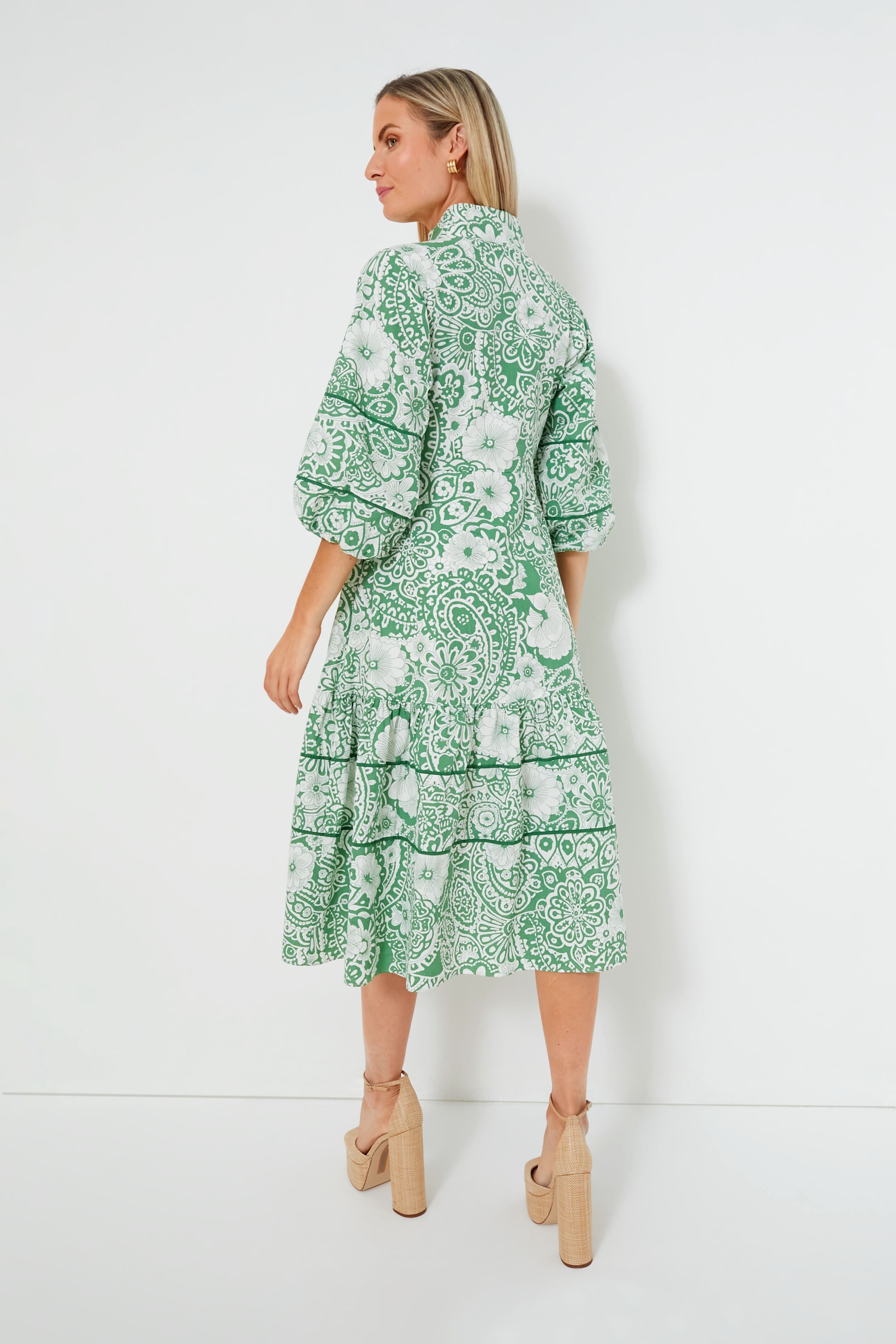 The Green and White Floral Hillsborough Dress is perfect for warm. breezy days lounging by the beach or going to lunch with friends. This midi boasts three-quarter length puff sleeves. a fit and flare silhouette. and a tiered skirt with piping panels. The eye-catching green is the cherry on top. creating an enchanting swirl of patterns and shapes. Pair with heels and a clutch. or with simple sandals and gold jewelry.