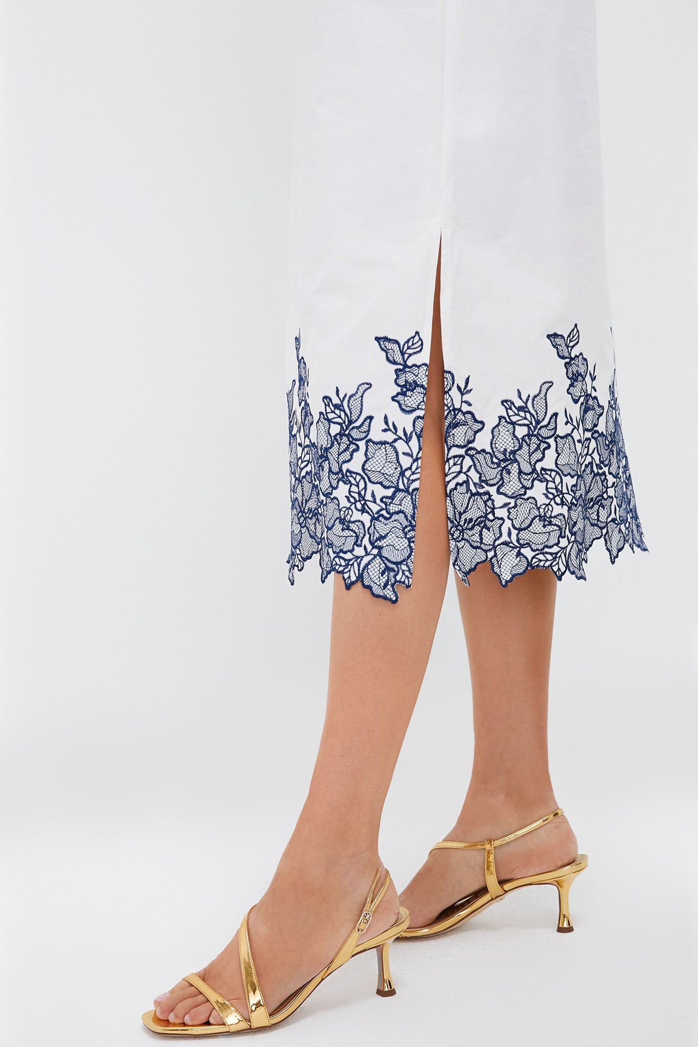 A chic. sophisticated style. we are loving the Navy Embroidery Eliza Midi Dress. Boasting a stand ruffle collar. short puff sleeves with an elastic smocked cuff. and intricate embroidery along the hem. this midi is easy yet elevated. Pair with white sneakers for running around town. or with sandals for a brunch date.